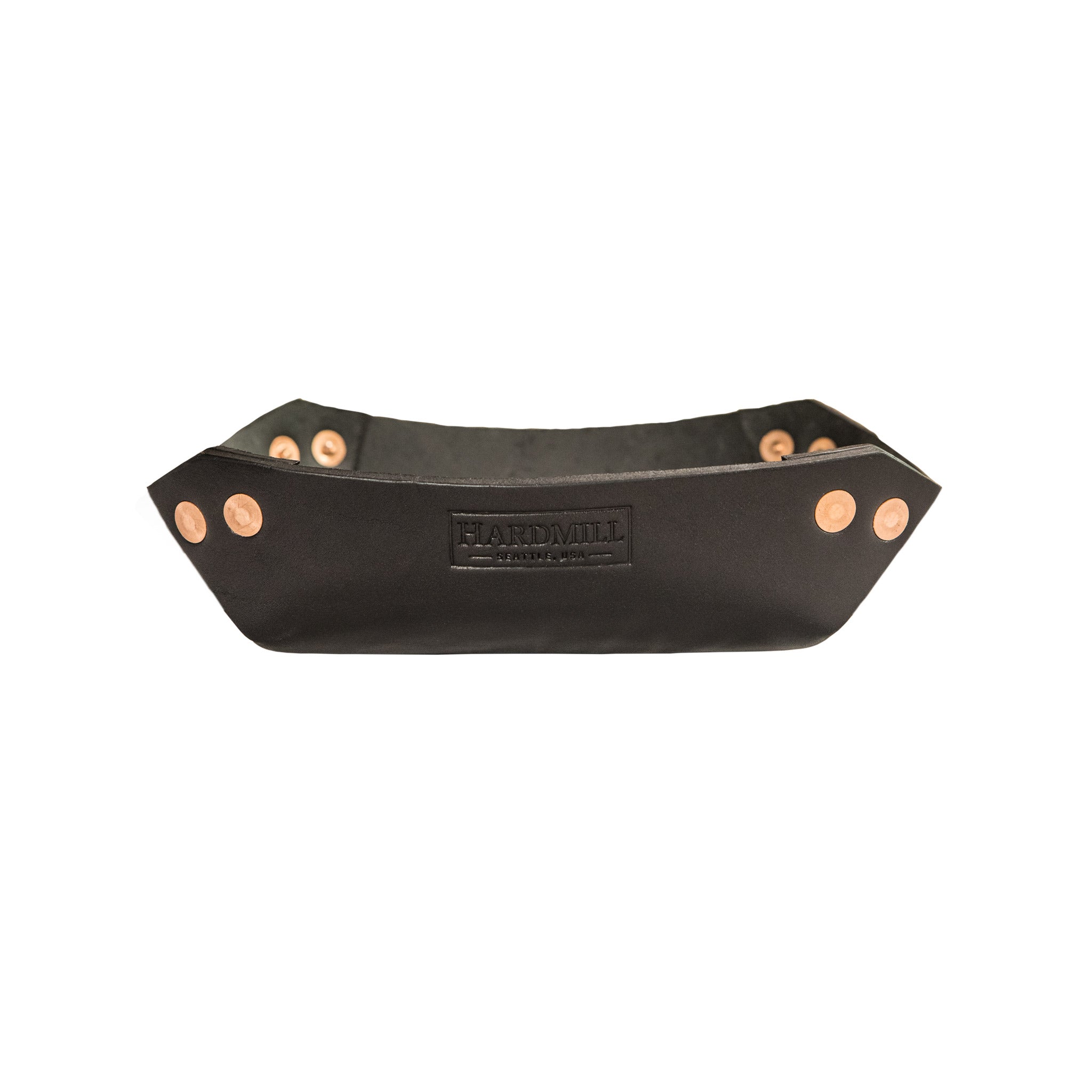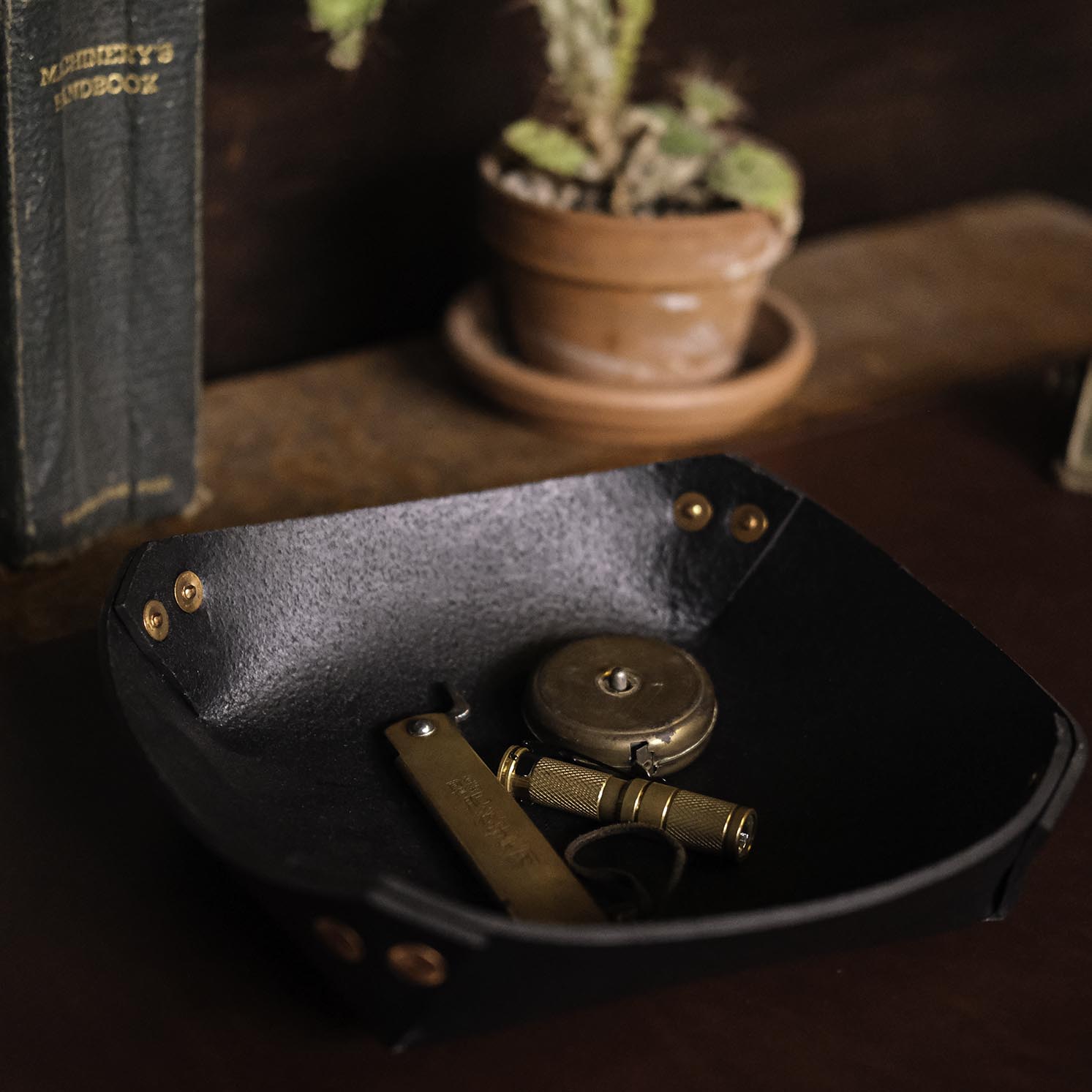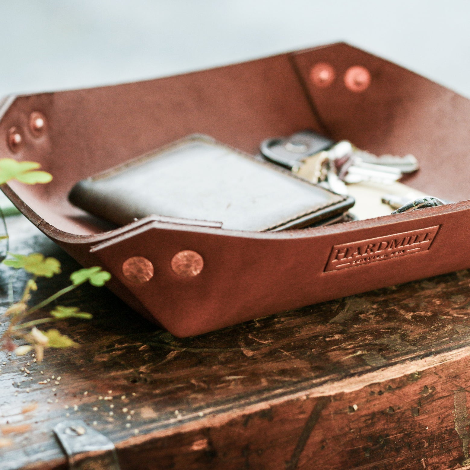 Built from thick bridle leather and copper rivets, this is a sure way to class up the top of any dresser.